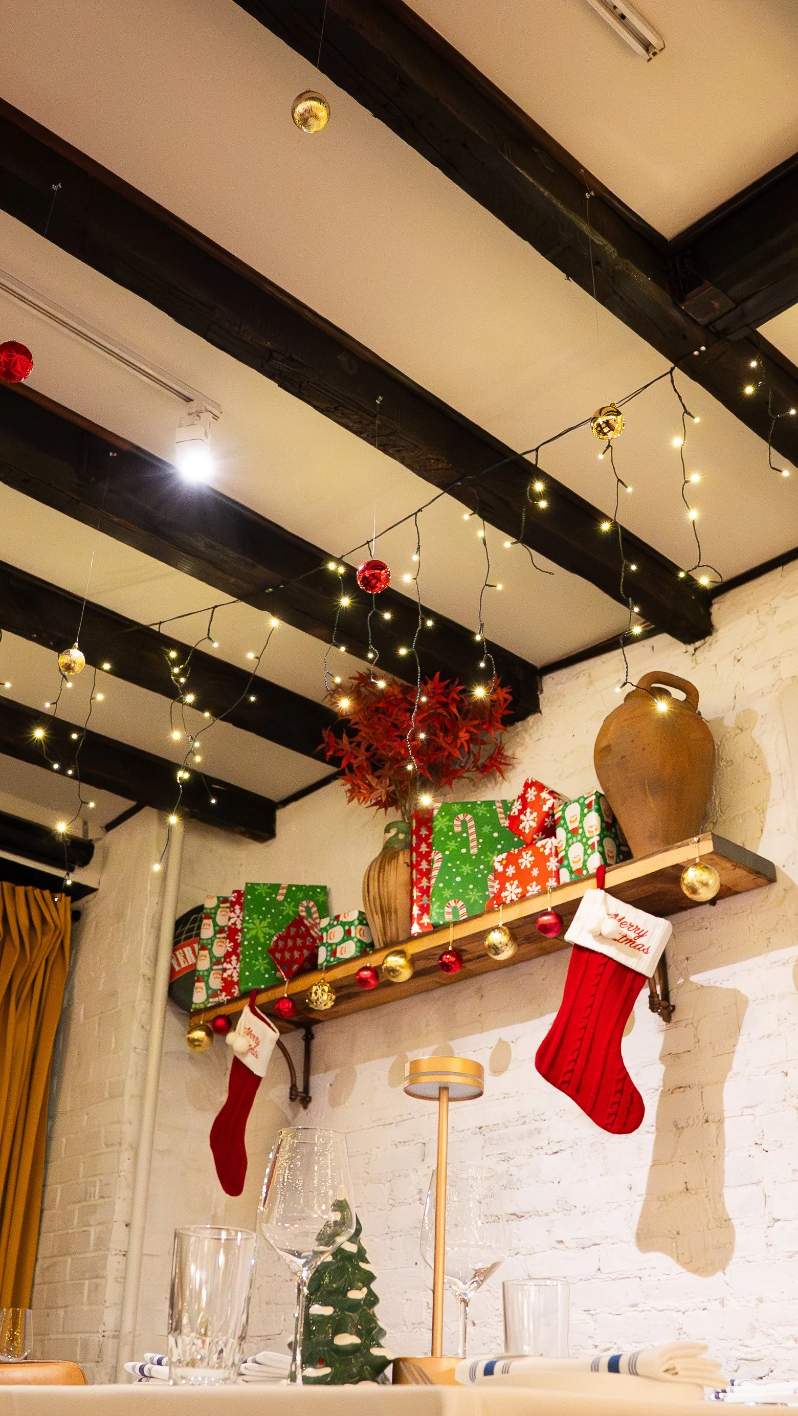 Holiday touches appear in all the right places. The warm lights soften the room. Seasonal details blend into the wood and stone of the interior. The ambiance feels festive without becoming loud or themed. It strikes the right balance between celebration and elegance.